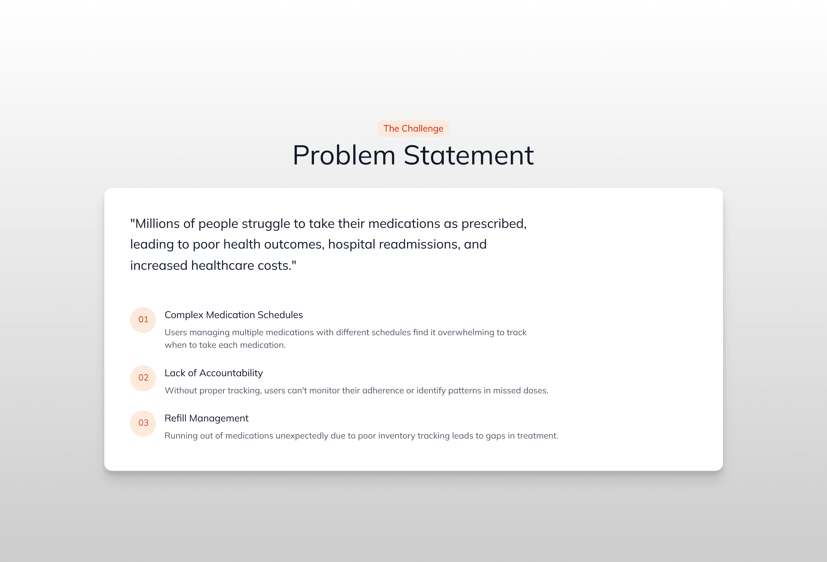 Users managing multiple medications with different schedules find it overwhelming to track when to take each medication. Without proper tracking, users can't monitor their adherence or identify patterns in missed doses. In UAE, we see diverse patient populations - expatriates, tourists, and locals. Language barriers and health literacy gaps lead to medication non-adherence. Many patients, especially elderly Emiratis managing diabetes and hypertension, struggle with complex medication schedules. We need multilingual solutions that work across Arabic and English seamlessly."
